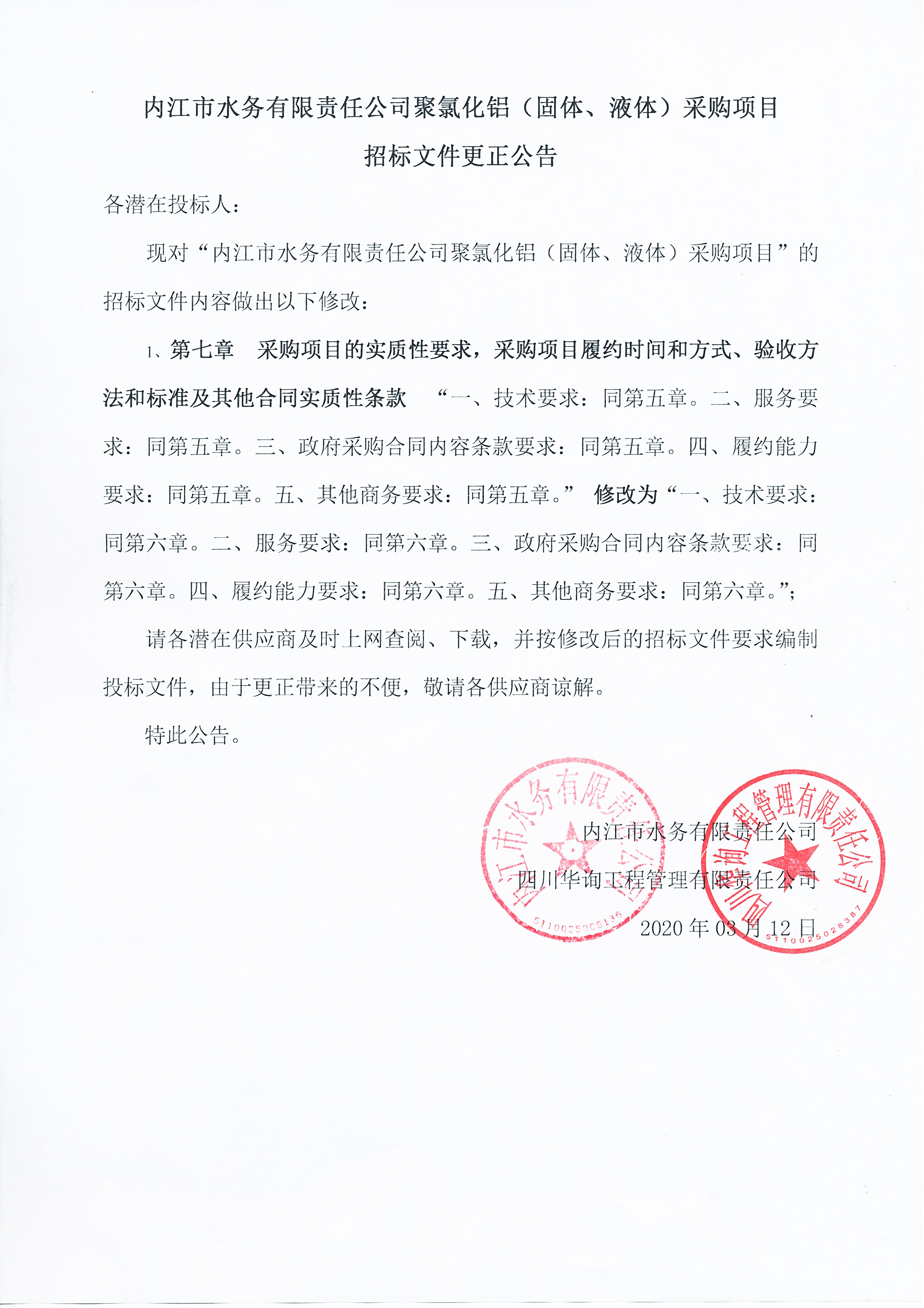 內(nèi)江市水務(wù)有限責(zé)任公司聚氯化鋁(固體、液體)采購項目招標(biāo)文件更正公告