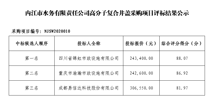 內(nèi)江市水務有限責任公司高分子復合井蓋采購項目評標結(jié)果公示