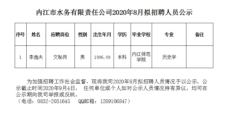 內(nèi)江市水務(wù)有限責任公司2020年8月擬招聘人員公示