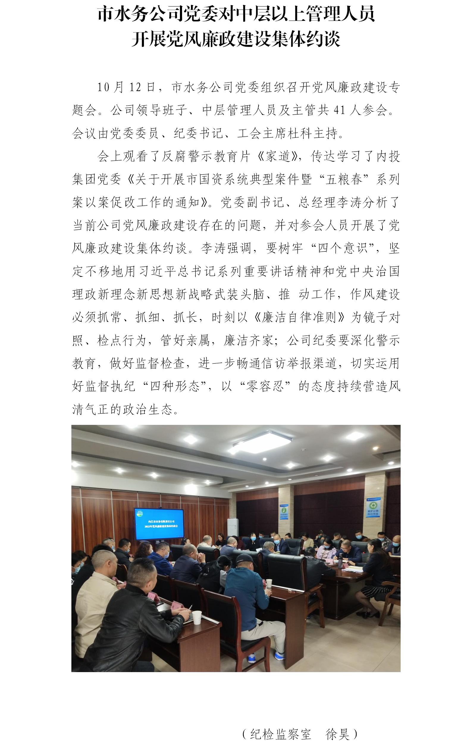 市水務(wù)公司黨委對中層以上管理人員開展黨風(fēng)廉政建設(shè)集體約談