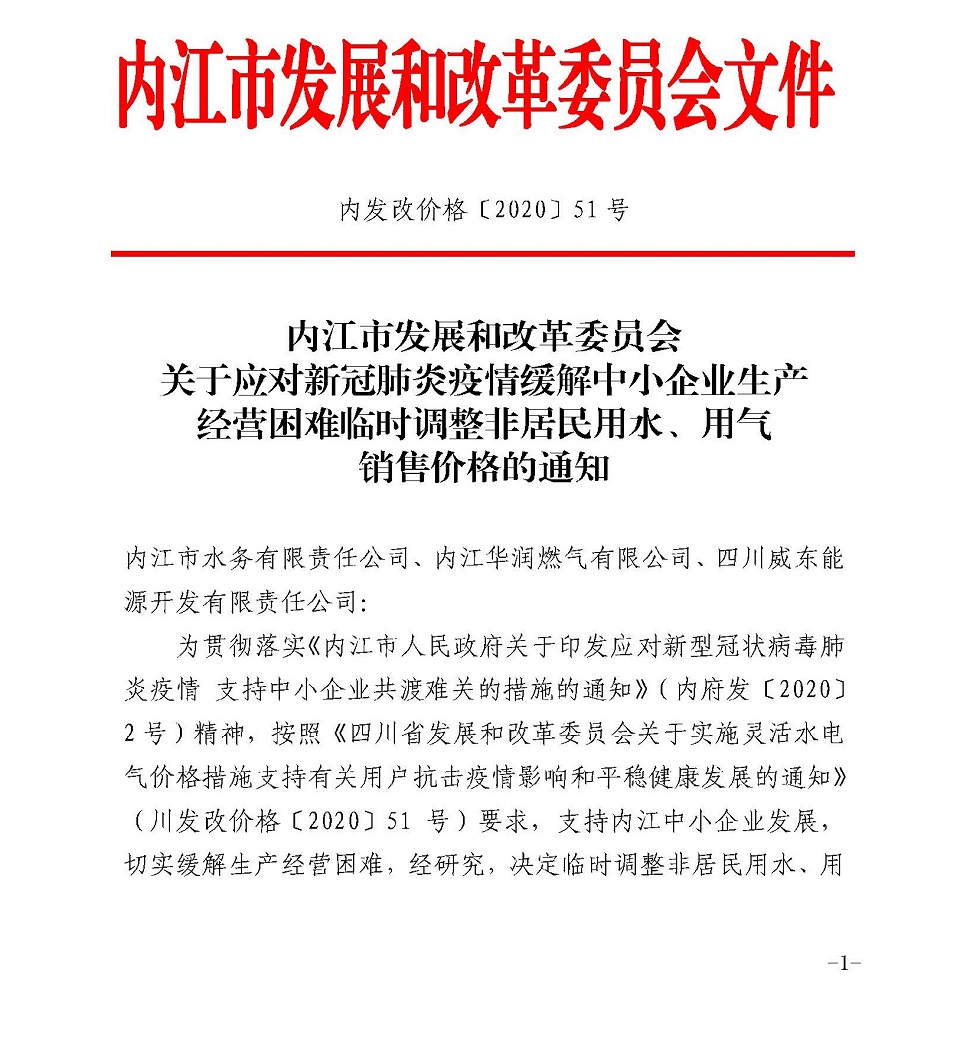 內(nèi)江市發(fā)展和改革委員會(huì)關(guān)于應(yīng)對新冠肺炎疫情緩解中小企業(yè)生產(chǎn)經(jīng)營困難臨時(shí)調(diào)整非居民用水、用氣銷售價(jià)格的通知