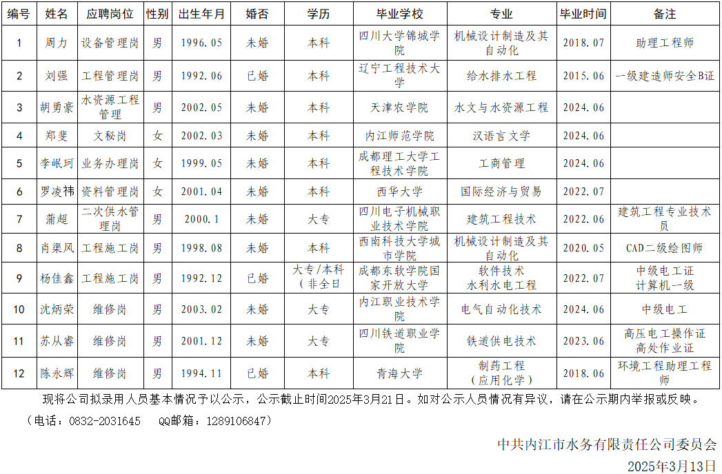 內(nèi)江市水務(wù)有限責任公司2025年3月擬招聘人員公示情況表