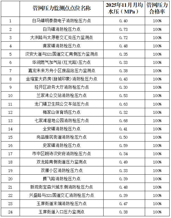 內(nèi)江市水務(wù)有限責(zé)任公司2025年11月管網(wǎng)壓力月報