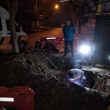 2月2日晚8點(diǎn)40分,接到市民報(bào)漏電話,位于晏家灣車站外的供水主管爆裂,部門立即組織人員趕往現(xiàn)場(chǎng)。經(jīng)查看確認(rèn)為一根DN150供水主管破裂,為了保障居民的正常用水,搶修人員連夜冒雨對(duì)供水管道進(jìn)行搶修,經(jīng)過5個(gè)小時(shí)的搶險(xiǎn)作業(yè),于次日凌晨1點(diǎn)完成搶修任務(wù),保障了該區(qū)域居民正常用水。