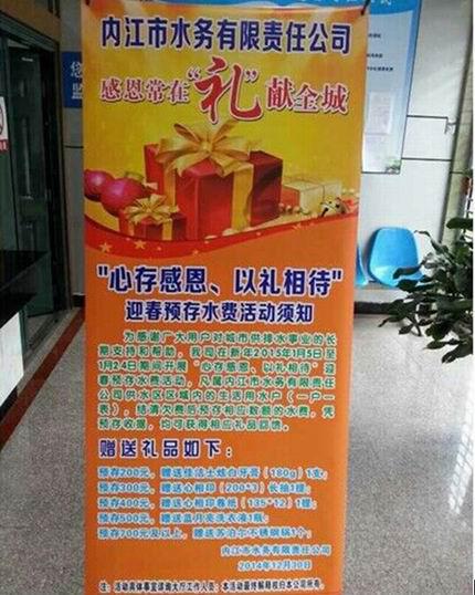 為感謝廣大用戶對(duì)城市供排水事業(yè)的長(zhǎng)期支持和幫助,我司在2015年1月5日至1月24日期間開(kāi)展“心存感恩、以禮相待”迎春預(yù)存水費(fèi)活動(dòng)。本次活動(dòng)由客戶服務(wù)部牽頭,在白馬辦事處、物資供應(yīng)部和機(jī)關(guān)各部門的支持配合下,圓滿結(jié)束。