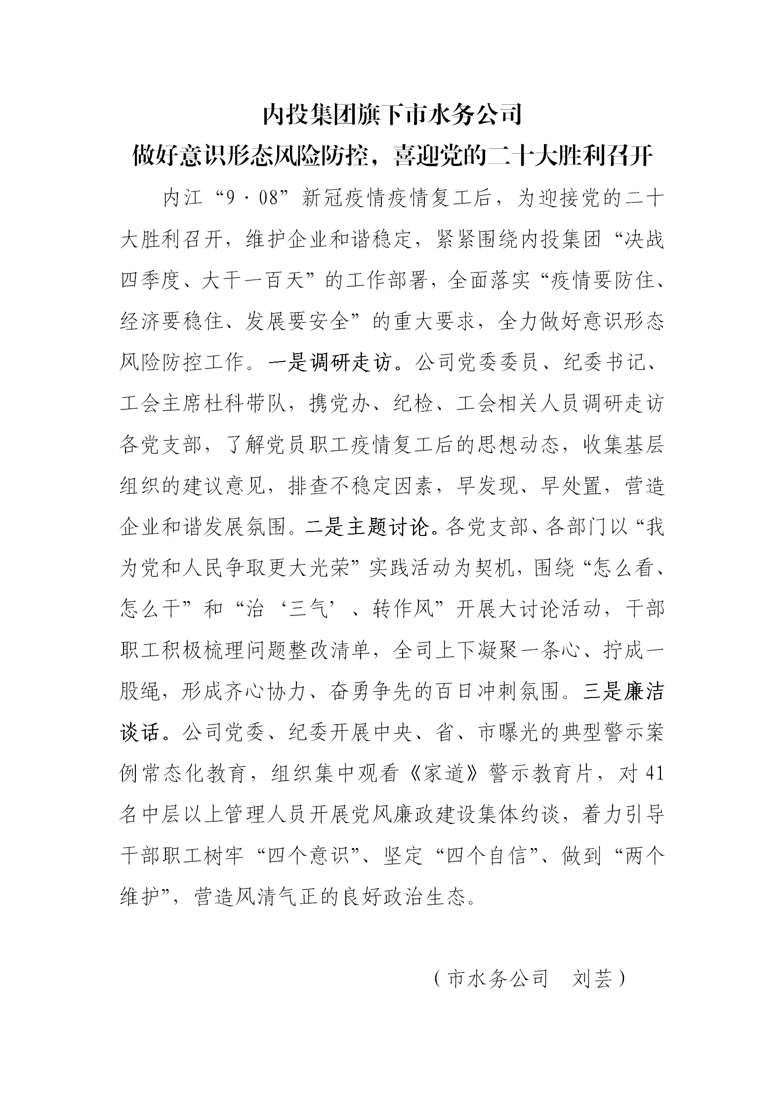 內(nèi)投集團旗下市水務公司 做好意識形態(tài)風險防控,喜迎黨的二十大勝利召開