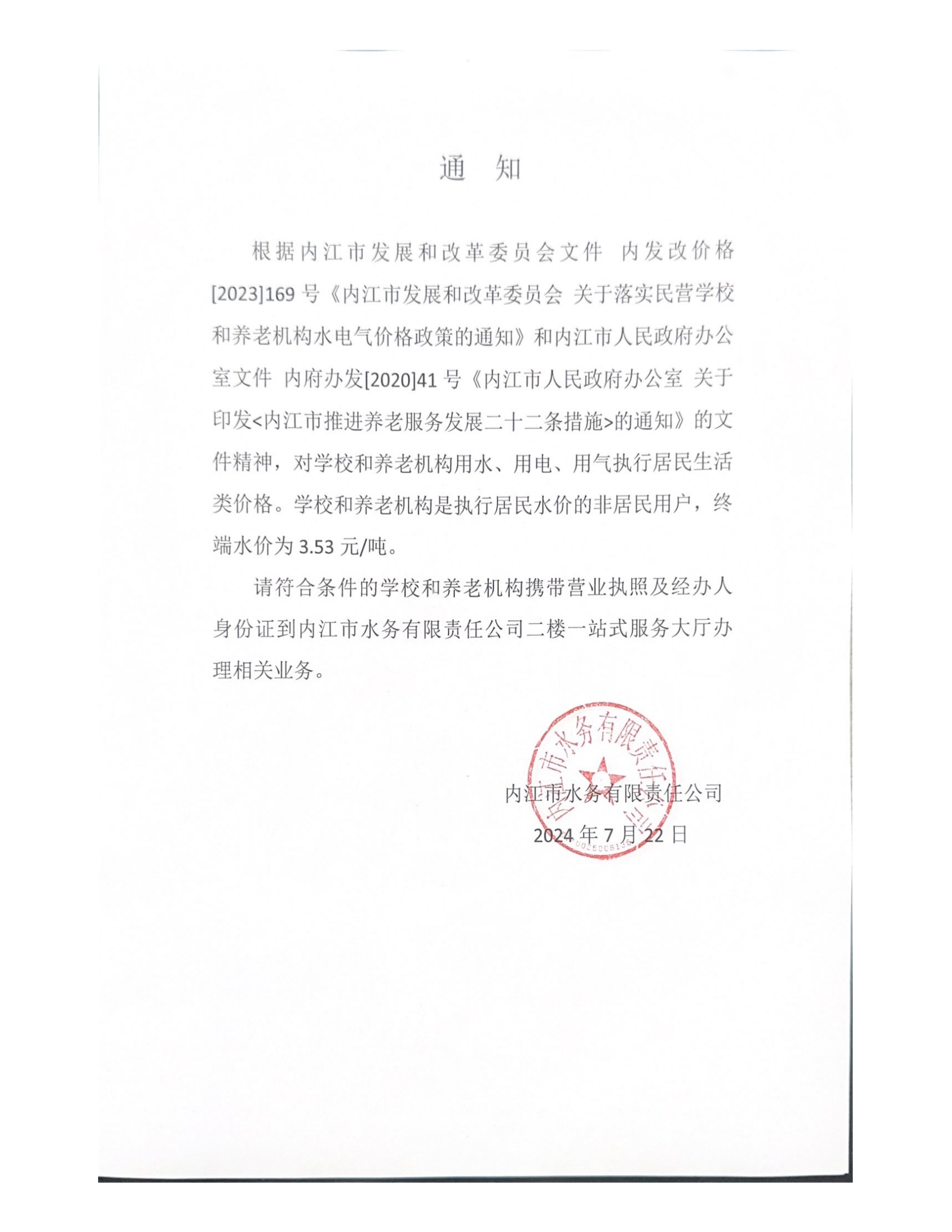 內(nèi)江市水務(wù)有限責(zé)任公司關(guān)于養(yǎng)老機(jī)構(gòu)、學(xué)校執(zhí)行生活用水價(jià)格的通知