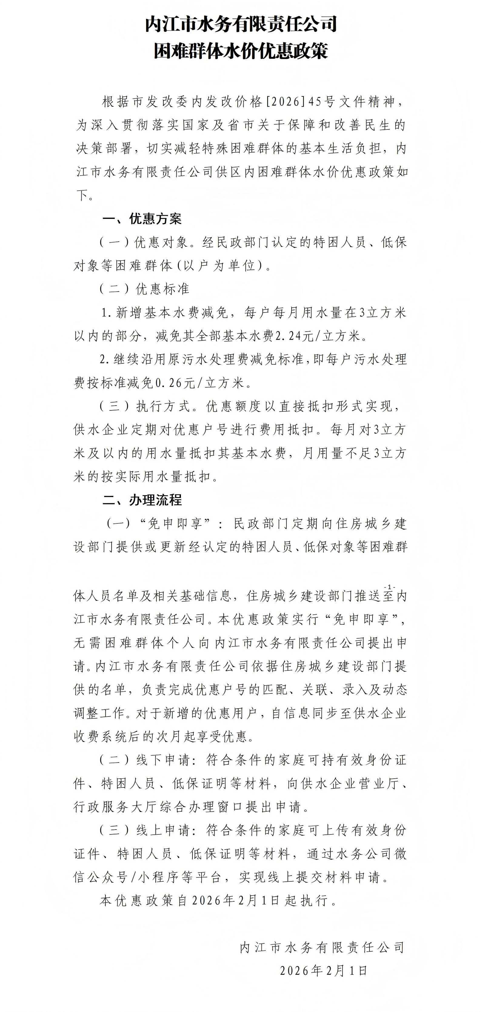 內(nèi)江市水務(wù)有限責(zé)任公司困難群體水價優(yōu)惠政策