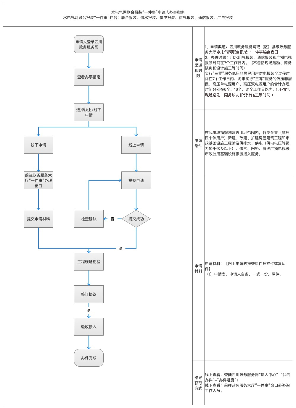 (一)網(wǎng)上申請(qǐng):申請(qǐng)人登錄四川政務(wù)服務(wù)網(wǎng)平臺(tái),點(diǎn)擊工程建設(shè)項(xiàng)目審批專欄,選擇具體報(bào)裝辦理事項(xiàng),提交申請(qǐng),上傳申請(qǐng)材料。